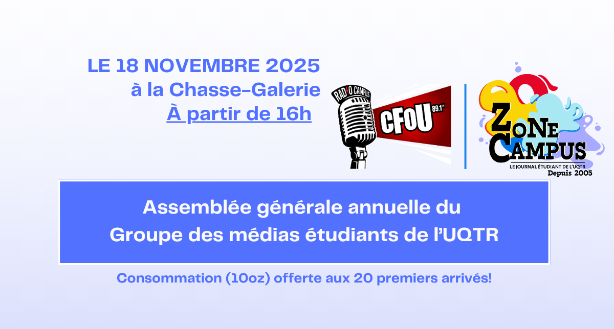 Le Groupe des médias étudiants de l’UQTR (GME UQTR), qui comprend la radio CFOU 89.1 FM et le journal Zone Campus invite les membres de la communauté étudiante à son Assemblée générale annuelle. Cette dernière se tiendra le mardi 18 novembre prochain à la Chasse-Galerie, à partir de 16h.
