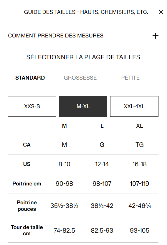 Charte des grandeurs. Crédits: H&M.