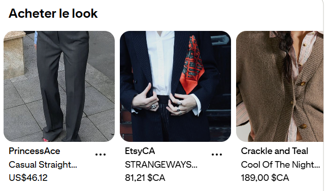 Maintenant que le tri de notre garde-robe est fait, nous pouvons commencer à ajouter des pièces à notre garde-robe! Ce qui est pratique aujourd’hui, c’est qu’avec internet, nous avons accès à beaucoup plus de choix de magasins avec des styles vestimentaires différents. Faites tout de même attention à la qualité et à l’éthique de ces boutiques. Cependant, avec un peu de recherche, vous trouverez certainement des endroits où acheter. Sur Pinterest, vous avez accès à la fonction « acheter ce look » qui suggère des articles inspirés de vos tenues d’inspiration. Cela permet de découvrir de nouvelles boutiques tirées directement de votre tableau d’inspiration.