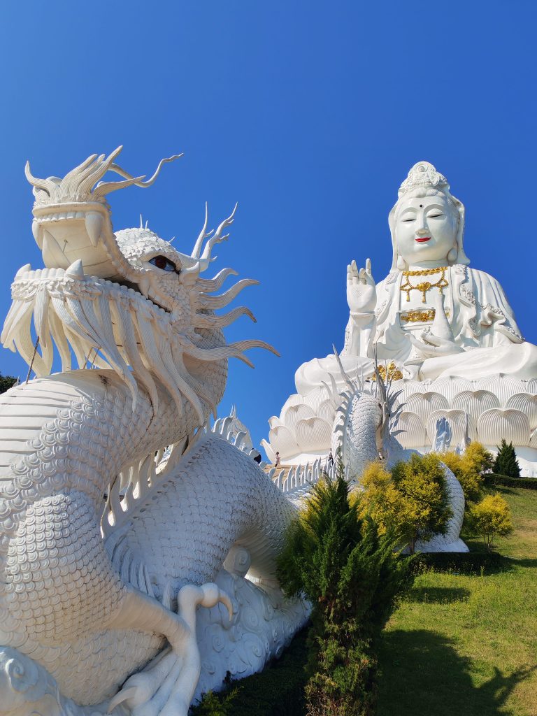En poursuivant vers le nord ou l’est, d’autres lieux méritent une attention bien particulière. Chiang Rai (à ne pas confondre avec son homologue Chiang Mai), notamment, se distingue par ses temples majestueux et singuliers. Le Wat Rong Khun (Wat signifie Temple en Thaï), connu sous le nom de Temple Blanc, surprend et fascine par son esthétique contemporaine et son éclat éblouissant. Non loin, le Wat Rong Suea Ten, ou Temple Bleu, offre une atmosphère plus apaisante, davantage baignée de teintes profondes et de détails minutieux.