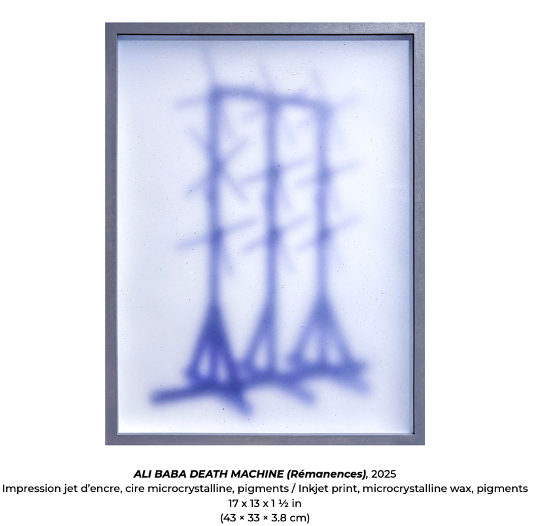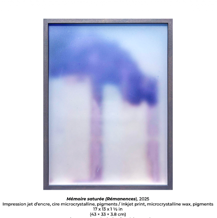 Dans cette exposition, Zacharie Gauvreau a réussi à créer des encadrements recouverts d’une couche de cire pigmentée. Cette cire devenant opaque avec le temps, l’œuvre est destinée à évoluer, se métamorphoser, s’abîmer dans un sens. C’est ainsi que l’artiste symbolise la transformation de l’image. Ces œuvres, immobiles et pourtant bien vivantes, incarnent une disparition lente, douce, presque organique. Dans cet univers à la fois poétique et technique, le regardeur est contraint de ralentir, d’observer ce que le flux numérique nous empêche souvent de voir : le silence entre deux images.