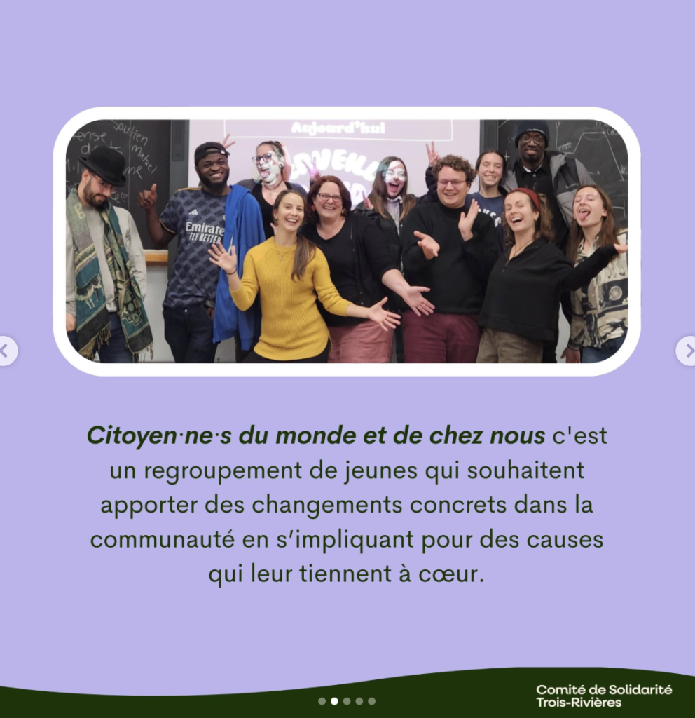 Le comité de solidarité de Trois-Rivières termine ainsi en lançant un appel à l’engagement : « Si tu as soif de changement, que tu es sensible aux droits humains, à l’environnement et à la justice sociale, le Comité de solidarité/Trois-Rivières est un espace accueillant pour se rassembler, se sensibiliser et se mobiliser pour la construction d’une société plus juste et solidaire. En plus, de se mettre en action, c’est un lieu de rencontre pour créer des liens, s’amuser et apprendre. »