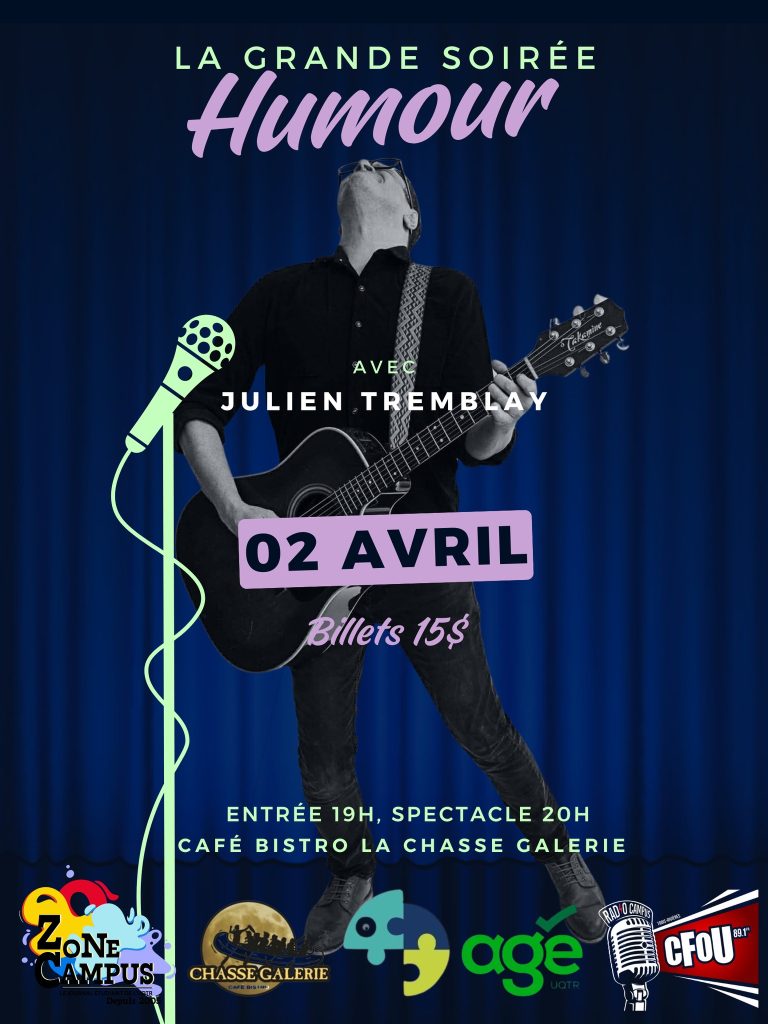 Le jeudi 2 avril dernier, le Café Bistro La Chasse-Galerie, sur le campus de Trois-Rivières, s’est rempli pour accueillir l’humoriste Julien Tremblay. Cet événement était organisé par l’association étudiante du baccalauréat en adaptation scolaire et sociale (ABASS).