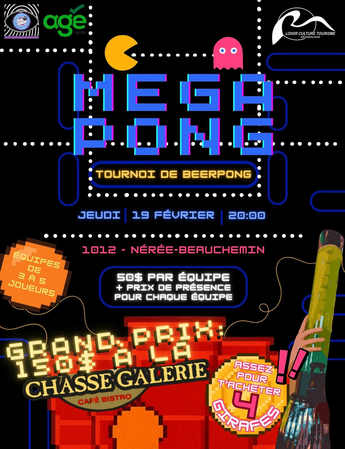Ce jeudi 19 février à 20h00 aura lieu Le Méga Pong, un tournoi de beer-pong organisé par l’AGE UQTR et l’Association des étudiants en récréologie. L’évènement se tiendra au local 1012 du pavillon Nérée-Beauchemin. Un grand prix de 150$ sera tiré sur place pour l’équipe gagnante.