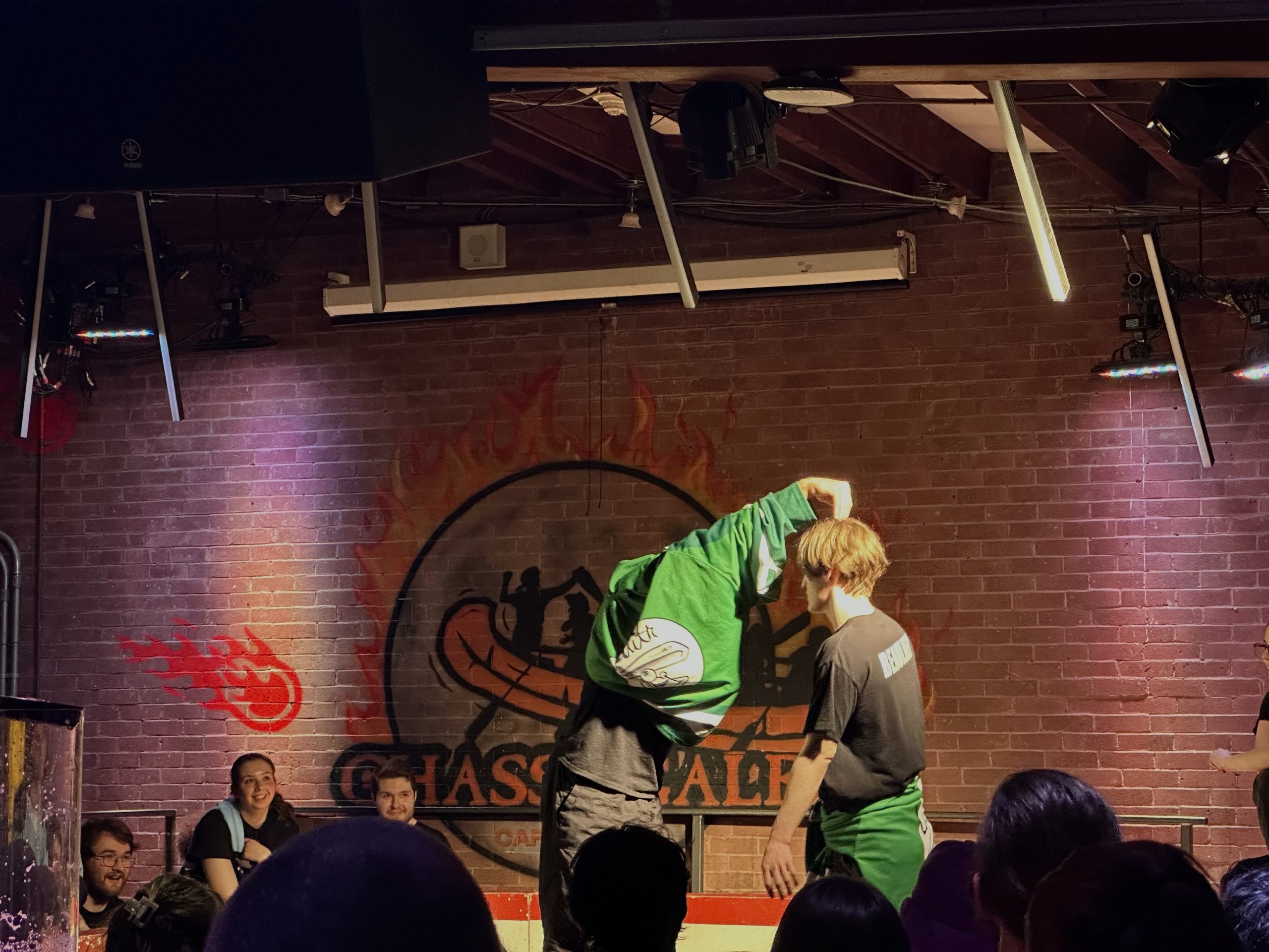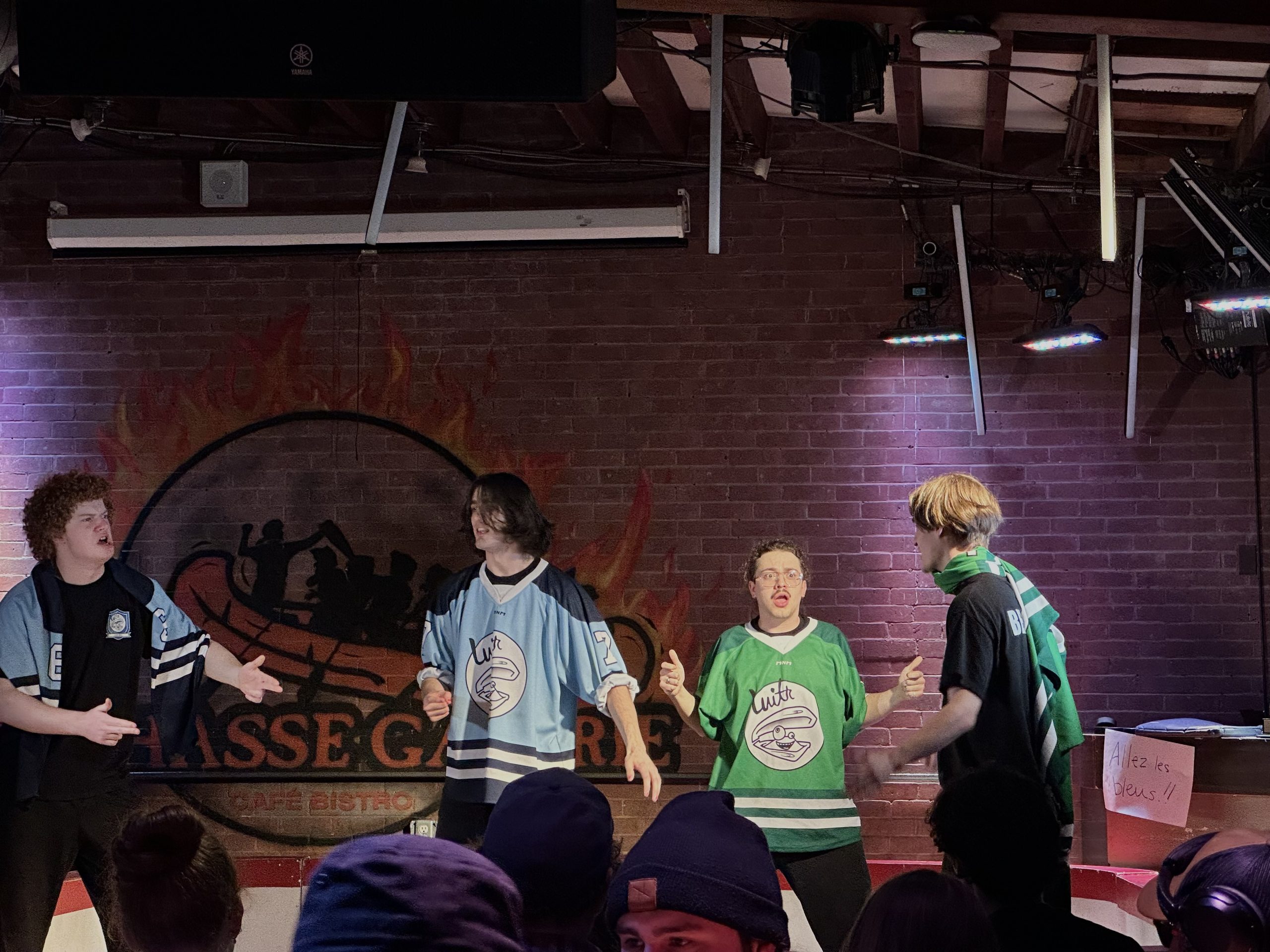 Pour cette grande finale, l’ambiance était à son comble. Les Verts et les Bleus se sont affrontés dans un match serré jusqu’à la toute fin. Du côté des Verts, on retrouvait leur capitaine Zachary Beaulieu, accompagné de Marianne Provencher, Simon Paradis-Côté, Juliette Paré et Ulrick Guipro-Lebel. Les Bleus, menés par Laurent Hamelin, comptaient sur Noah Cadieux, Kim Dubois, Jasmin Defoy et Anthony Landry. Les deux équipes ont enchaîné les improvisations avec intensité, déclenchant rires et réactions enthousiastes dans la salle. La soirée a été riche en rebondissements, avec quelques pénalités données par l’arbitre. On a même eu la chance d’assister à un affrontement improvisé entre Zachary Beaulieu et Ulrick Guipro-Lebel.